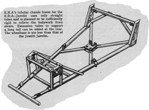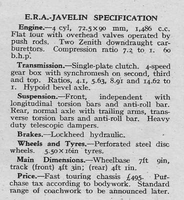 "This E.R.A.-Javelin interested us very much indeed, for at last Motor Sport's plea for a lightweight British tubular-chassis high-performance car seemed to have been answered, although the engine is of 1,500 c.c., whereas 1,100 c.c. is effectively employed in such chassis on the Continent.