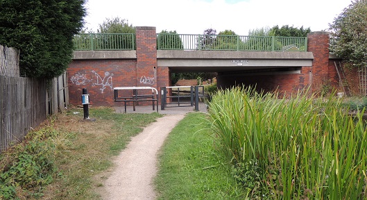 Rail bridge - which did carry the South Staffordshire Railway to Brownhills. The track bed is currently a walkway - "The McClean Way" On the left - taken looking North - 08/08/2018. On the right - The north-west corner of the Bridge - 08/08/2018. Access access via steps from "The McClean Way" 14 miles and 4½ furlongs from Horseley Fields
