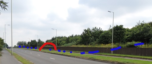 line of the eastern lane of current A460 Eastern Way dual